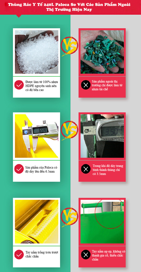 Tất cả các loại thùng rác y tế 240l Paloca do Hành Tinh Xanh cung cấp ra thị trường đều đã qua kiểm định kĩ càng về chất lượng và đạt tiêu chuẩn an toàn để đưa vào sử dụng tại các bệnh viện, nên quý khách hoàn toàn có thể yên tâm khi chọn mua sản phẩm của chúng tôi.