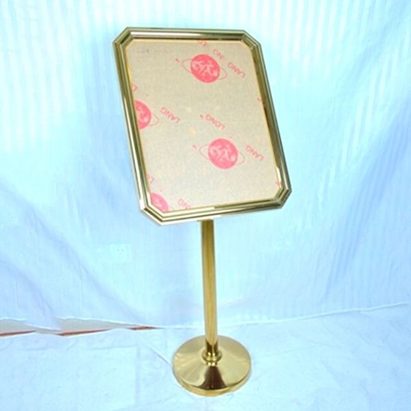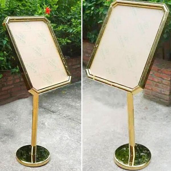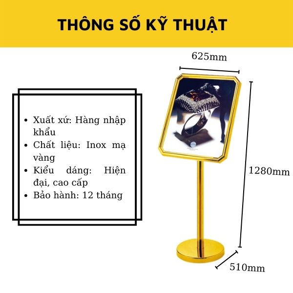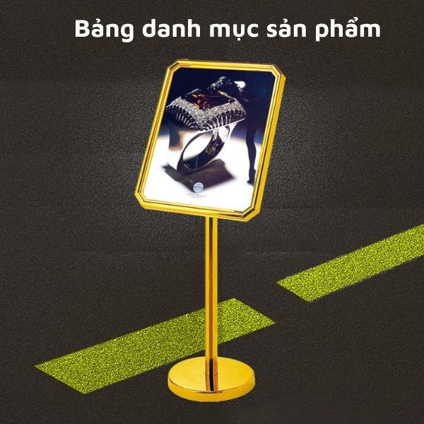 - Sản phẩm bảng hướng dẫn được làm bằng chất liệu inox mạ vàng cao cấp, chắc chắn. Chất liệu inox có độ bền đẹp cao, không han gỉ trong quá trình sử dụng. Khung bảng danh mục mạ vàng mang tính thẩm mỹ cao, tạo ấn tượng cho không gian đặt.