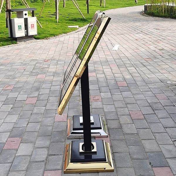 - Mặt bảng bằng kính cường lực có độ bền cao, chống xước, chống mài mòn tốt. Mặt bảng chào được thiết kế tách rời, gắn chặt bẳng khóa sắt không gỉ phía sau. Thiết kế tách rời giúp thay banner, thông tin, thông báo một cách dễ dàng.